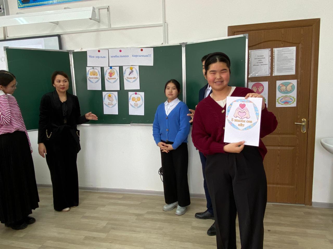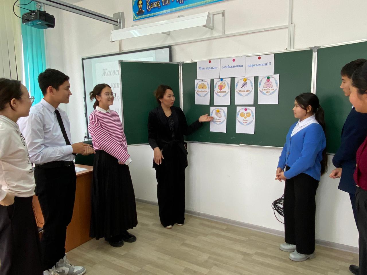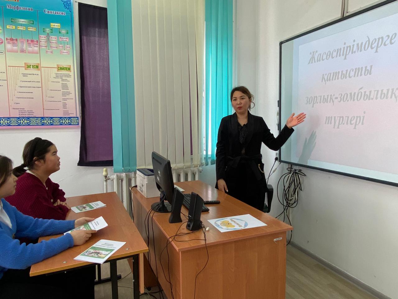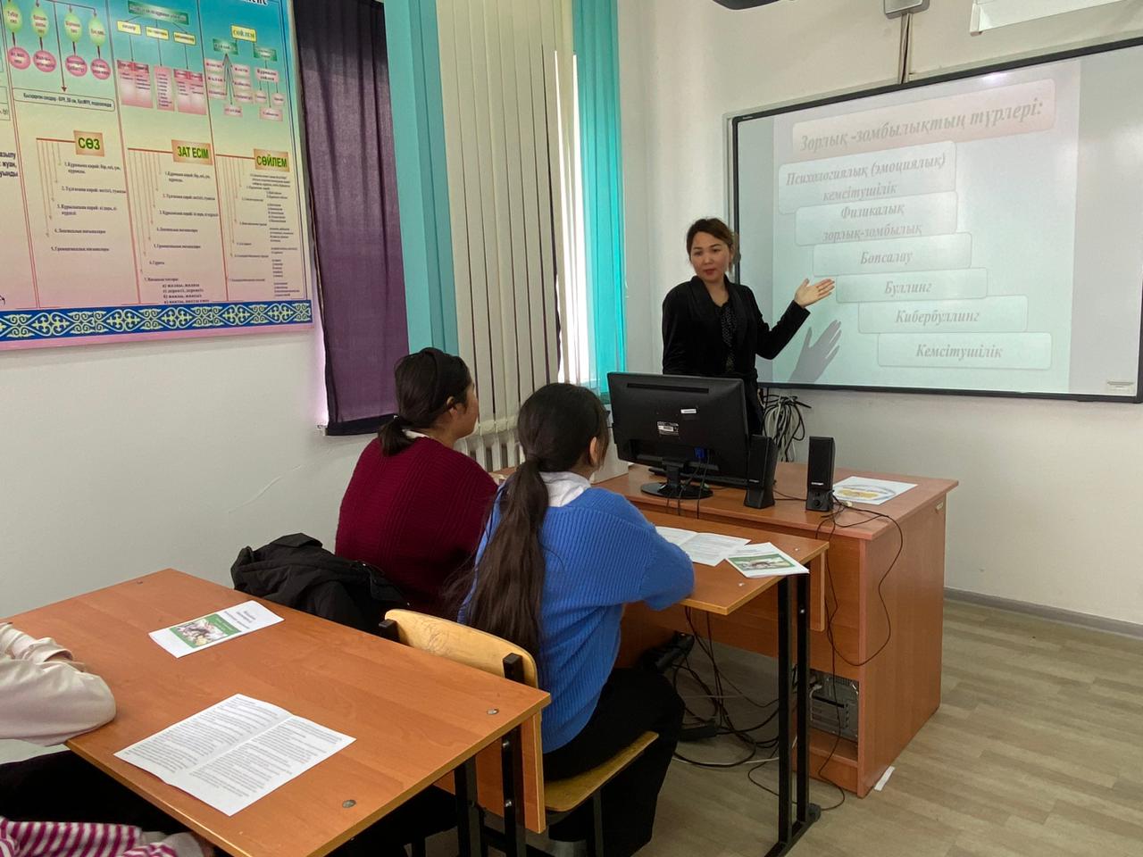 Тарас негізгі орта мектебінде "Мен зорлық- зомбылыққа қарсымын!" тақырыбында мектеп психологы А.Б Кожакова 8-9сынып оқушыларына түсіндірме жұмыстарын жүргізді.